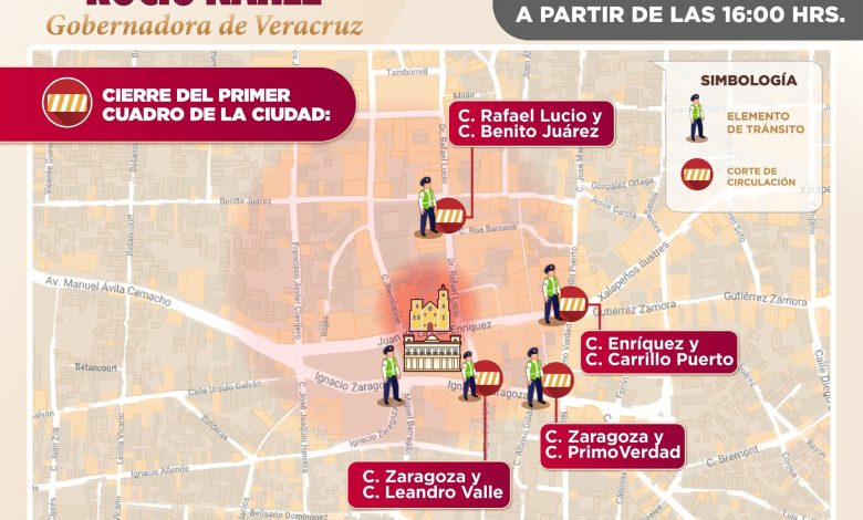 Xalapa, Ver.- Derivado del primer informe ciudadano de la gobernadora Rocío Nahle García, a partir de este jueves a las 4 de la tarde se llevarán a cabo cierres viales en el primer cuadro de la ciudad de Xalapa, por lo que será necesario tomar precauciones y vías alternas.