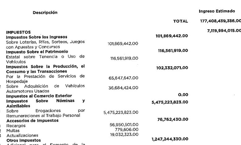La recaudación estatal propia se estima en 7 mil 119 millones de pesos, siendo los impuestos más relevantes el Impuesto sobre Nómina, con ingresos proyectados por 5 mil 475 millones de pesos, y el Impuesto Adicional para el Fomento de la Educación, con 1 mil 247 millones de pesos.