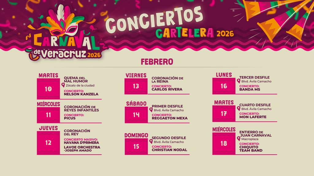 Veracruz, Ver., 17 de diciembre de 2025.– Con una programación artística que combina géneros, públicos y escenarios, el Carnaval de Veracruz 2026 contará con la participación estelar de Carlos Rivera, Christian Nodal, Banda MS y Mon Laferte, intérpretes de talla internacional que encabezarán la edición 102 de la fiesta de todos, a celebrarse del 10 al 18 de febrero.