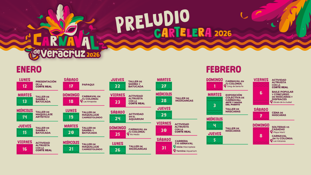 Tras la proyección del video de la canción oficial, se dio a conocer el calendario de actividades, que arranca con el Preludio del Carnaval el 12 de enero, fecha en la que será presentada la Corte Real 2026, y que se desarrollará con talleres de artes plásticas, bailes, eventos deportivos y de convivencia comunitaria.