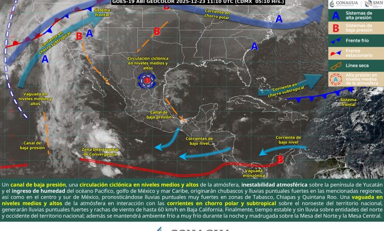 Este día, un canal de baja presión sobre el oriente y sureste del país, una circulación ciclónica en niveles medios y altos de la atmósfera sobre el noreste del territorio nacional, inestabilidad atmosférica sobre la península de Yucatán y el ingreso de humedad del océano Pacifico, golfo de México y mar Caribe, originarán chubascos y lluvias puntuales fuertes en las mencionadas regiones, así como en el centro y sur de México, pronosticándose lluvias puntuales muy fuertes en zonas de Tabasco (sur), Chiapas (norte) y Quintana Roo (norte y centro). A su vez, una vaguada en niveles medios y altos de la atmósfera en interacción con las corrientes en chorro polar y subtropical sobre el noroeste del territorio nacional, generarán lluvias puntuales fuertes y rachas de viento de hasta 60 km/h en Baja California. Finalmente, continuará tiempo estable y sin lluvia sobre entidades del norte y occidente del territorio nacional; además se mantendrá ambiente frío a muy frío durante la noche y madrugada sobre entidades de la Mesa del Norte y la Mesa Central.
