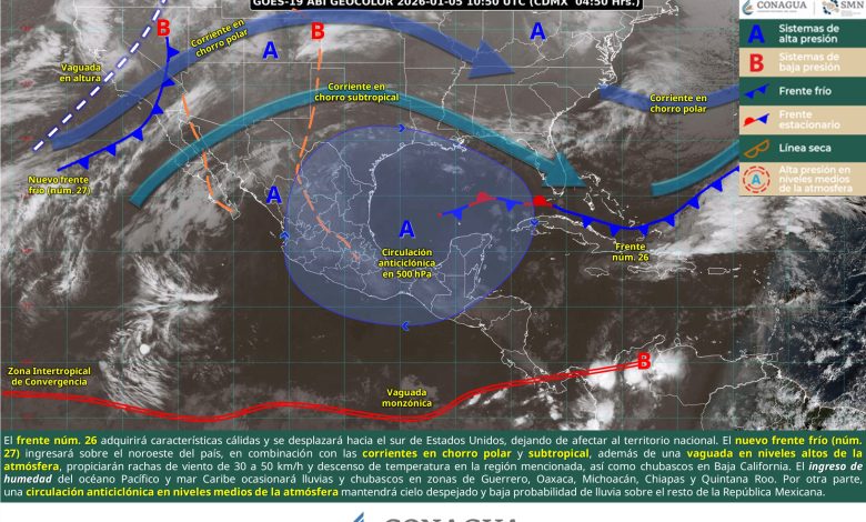 En el transcurso de este día, el frente núm. 26 adquirirá características cálidas y se desplazará hacia el sur de Estados Unidos, dejando de afectar al territorio nacional. Simultáneamente, el nuevo frente frío (núm. 27) ingresará sobre el noroeste del país, en combinación con las corrientes en chorro polar y subtropical, además de una vaguada en niveles altos de la atmósfera, propiciarán rachas de viento de 30 a 50 km/h y descenso de temperatura en la región mencionada, así como chubascos en Baja California. A su vez, el ingreso de humedad del océano Pacífico y mar Caribe ocasionará lluvias y chubascos en zonas de Guerrero, Oaxaca, Michoacán, Chiapas y Quintana Roo. Por otra parte, una circulación anticiclónica en niveles medios de la atmósfera mantendrá cielo despejado y baja probabilidad de lluvia sobre el resto de la República Mexicana. Finalmente, se mantendrá el ambiente frío a muy frío, con heladas y bancos de niebla matutinos en estados de la Mesa del Norte y la Mesa Central.