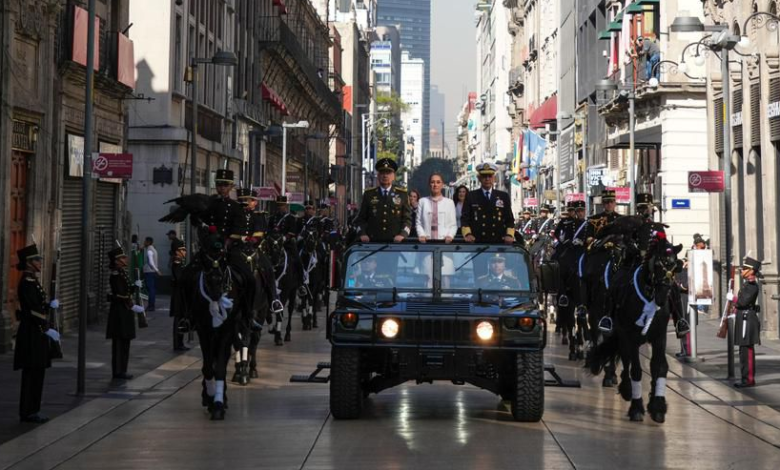 Durante el trayecto, la presidenta viajó en una unidad descubierta, acompañada por los titulares de la Secretaría de la Defensa Nacional y de la Secretaría de Marina, el general Ricardo Trevilla Trejo y el almirante Raymundo Pedro Morales Ángeles, respectivamente, en su calidad de mandos de las Fuerzas Armadas.