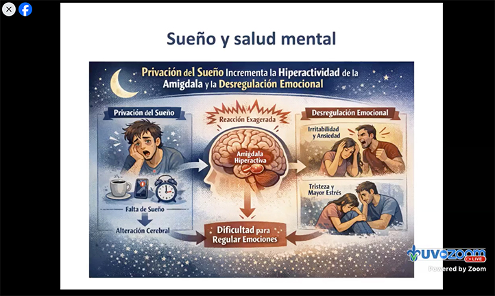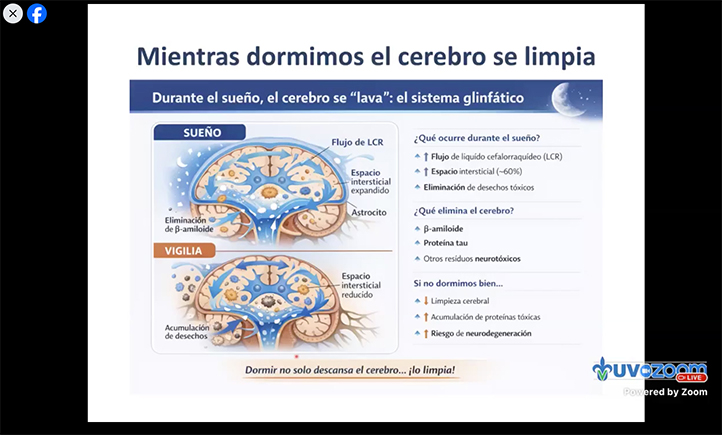Enfatizó que dormir adecuadamente favorece funciones esenciales como el aprendizaje, la memoria y la regulación hormonal, además de fortalecer el sistema inmunológico. También señaló que durante este proceso el cerebro elimina desechos metabólicos, proceso que contribuye a reducir el riesgo de enfermedades neurodegenerativas.