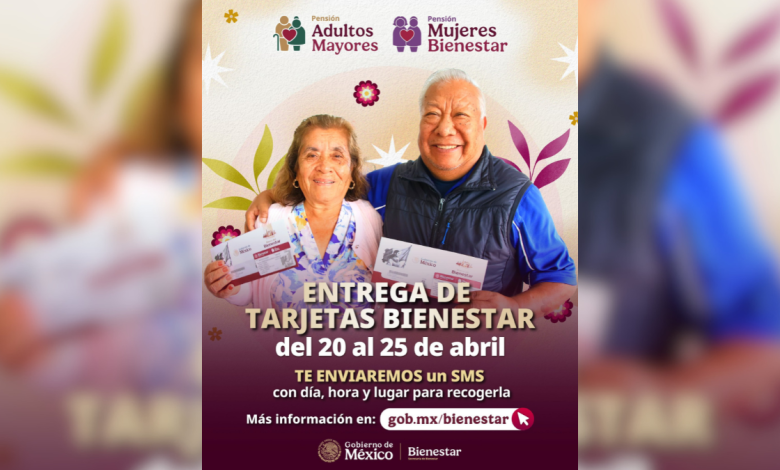 La Secretaría de Bienestar realiza del 20 al 25 de abril la entrega de tarjetas de las Pensiones Mujeres Bienestar y para Personas Adultas Mayores, dirigidas a quienes se registraron durante el mes de febrero.