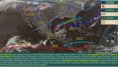 El frente núm. 22 se desplazará hacia el oriente del golfo de México y dejará de afectar al país. Una…